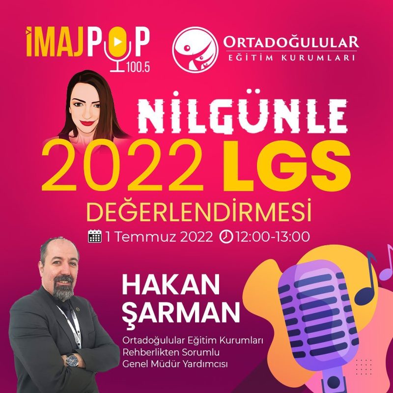 Ortadoğulular Eğitim Kurumu Rehberlikten Sorumlu Genel Müdür Yardımcısı Hakan Şarman, sonuçları açıklanan LGS değerlendirmesi yapmak üzere yarın 12.00-13.00 arası İmaj Pop’ta Nilgün Durmuşoğlu’nun konuğu olacak. Bu yayını sakın kaçırmayın!